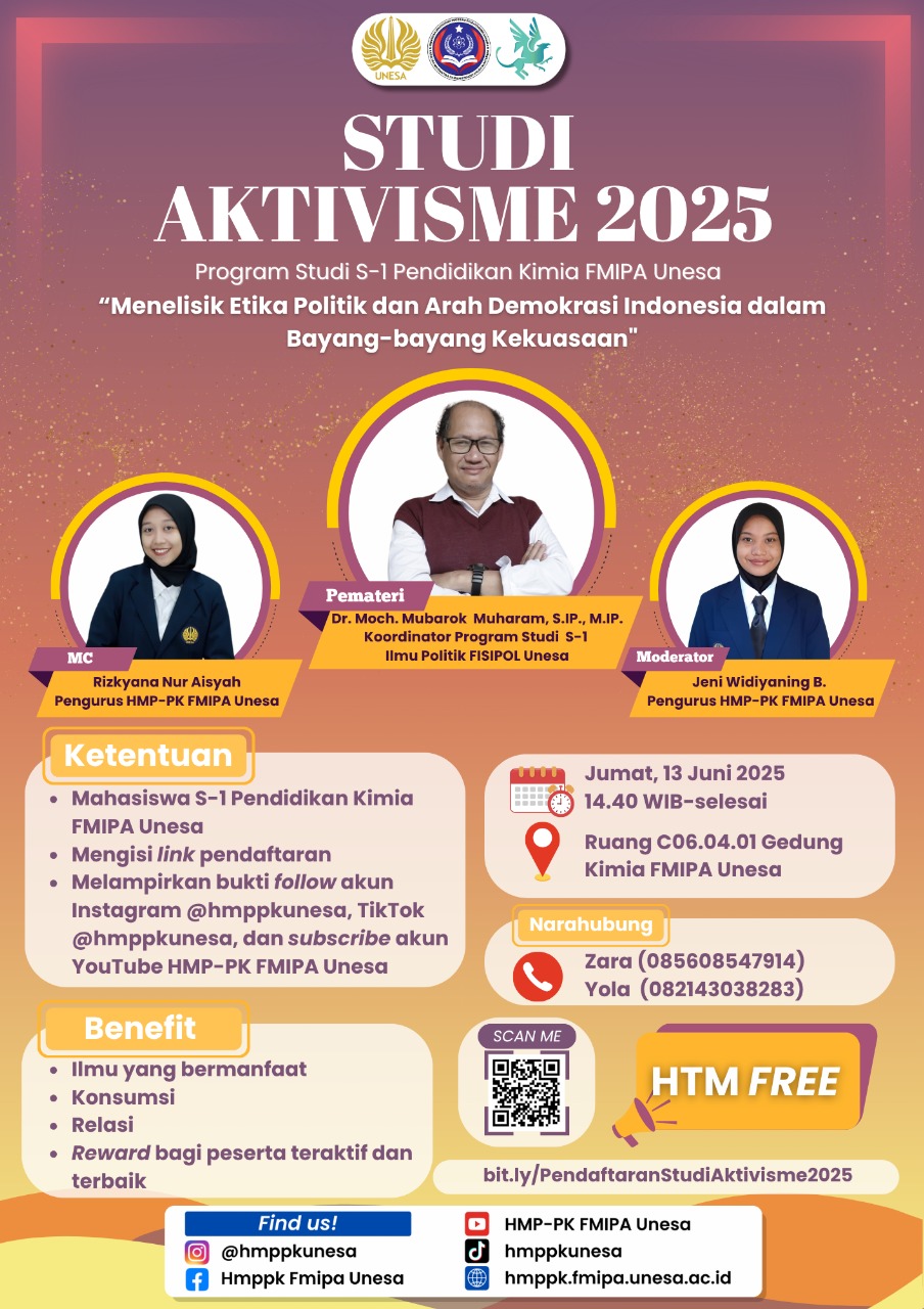 Ayo bangkit bareng! Studi Aktivisme hadir sebagai wadah untuk mengasah jiwa kritis dan aksi nyata Mahasiswa S-1 Prodi Pendidikan Kimia.